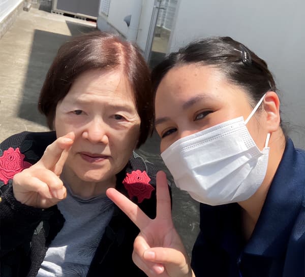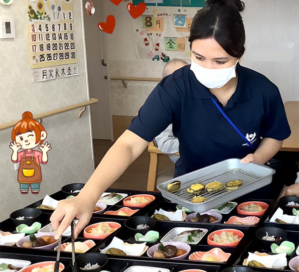 I was worried at first because it was another new environment. I had to write reports and cook for the elder residents, too. But thanks to my coworkers who helped me so much, I’ve learned how to cook Japanese dishes — and now I even make them at home. Seeing the elder residents enjoy the food I prepare makes me want to keep improving my cooking skills. More than that, it motivates me to grow in every way I can.